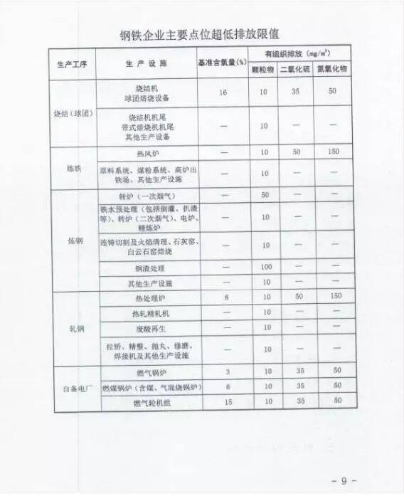 2018年10月底前,全市所有鋼鐵企業(含獨立球團、高爐鑄造企業,下同)全部達到超低排放水平(限值參照驗收標準,通過168小時運行且第三方監測達標,95%以上小時均值排放達標),并完成濕煙氣脫白治理,凡達不到標準的實施停產整治。