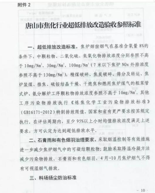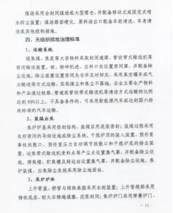 2018年9月底前,全市所有焦化企業全部達到超低排放水平(限值參照驗收標準,通過168小時運行且第三方監測達標,95%以上小時均值排放達標),并完成濕煙氣脫白治理改造,凡達不到標準的實施停產整治